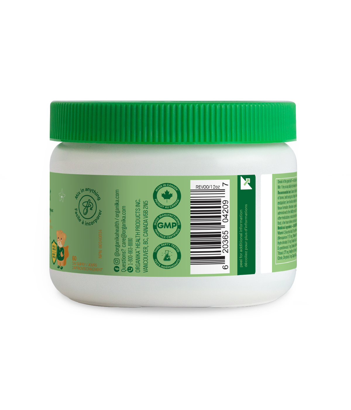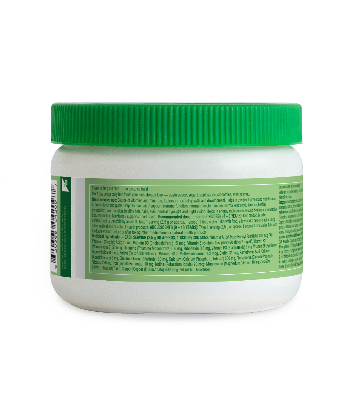 RECOMMENDED DOSE (oral) children (4 – 18 years) only: Take 1 serving (1 scoop = 2.5 g) 1 time a day. Take with food, a few hours before or after taking other medications or natural health products. Recommended to mix with juice, yogurt, or cool to warm foods and drinks.