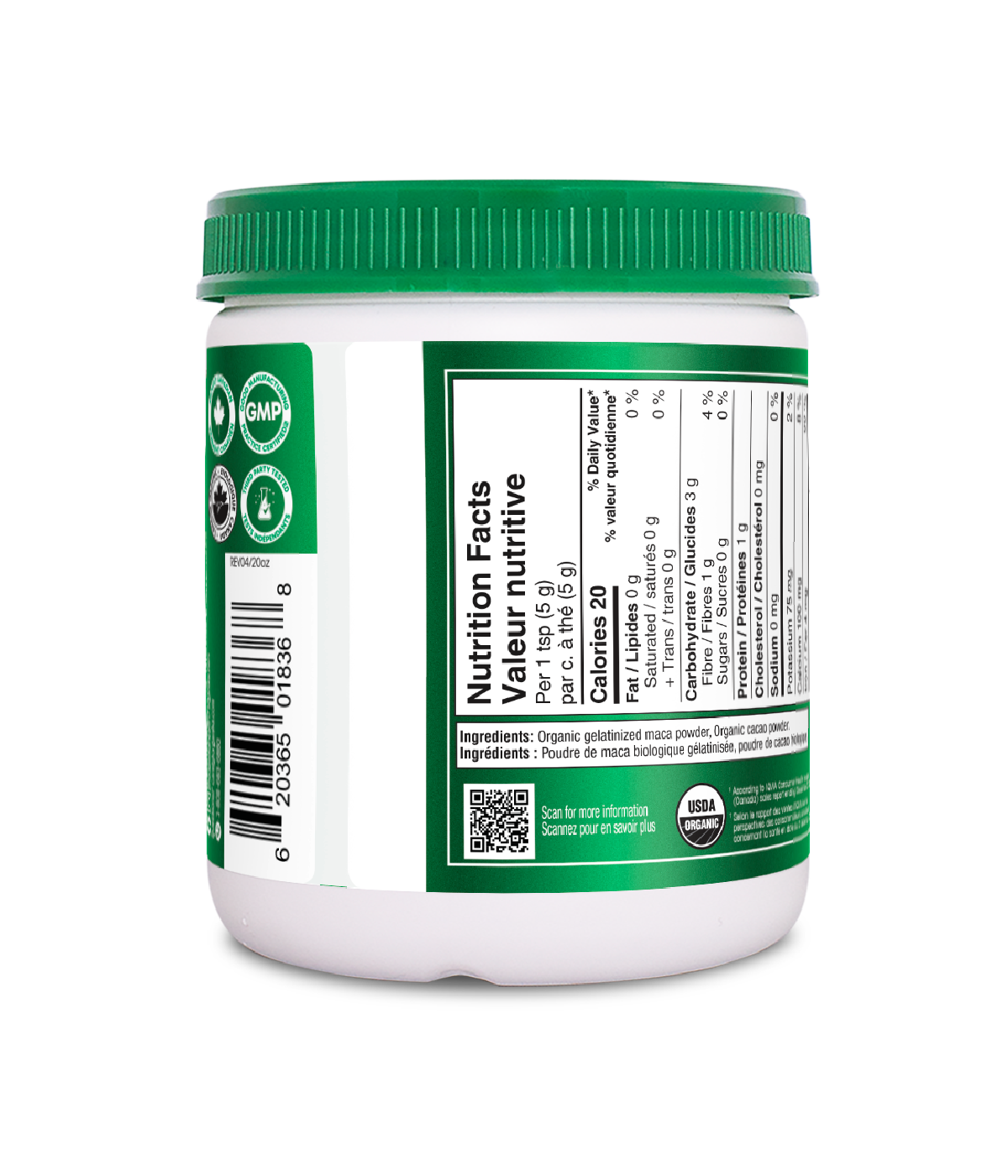 Ingredients: Organic gelatinized* maca powder, Organic cacao powder. *Gelatinization does not involve gelatin in any form. This product is completely vegan friendly.