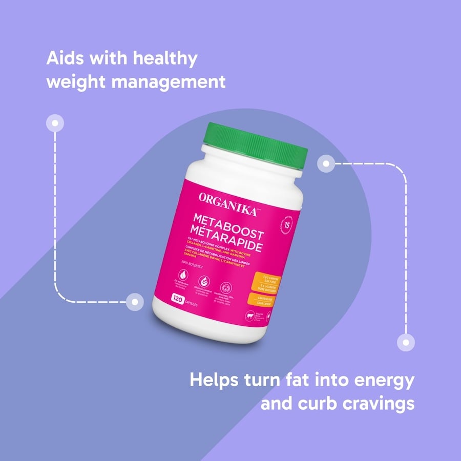 Boost, burn, thrive. These metaboosting capsules are a thoughtful blend of hydrolyzed bovine collagen, L-Carnitine, Garcinia and Chromium. This effective lineup of clinically studied ingredients are designed to help your body turn fat into fuel while also supporting lean muscle and protein synthesis. L-Carnitine plays a key role in transporting fatty acids into your cells' energy centres (aka mitochondria), while Garcinia and Chromium help manage cravings and support more stable blood sugar. Collagen rounds it out by reinforcing muscle, joint and connective tissue health.
